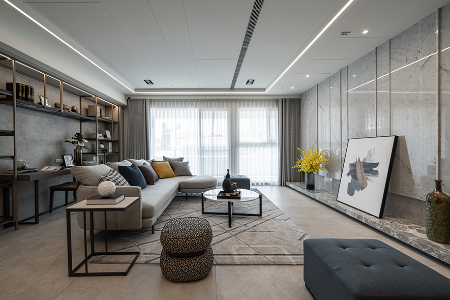對於紛擾全球的COVID-19,詠絮室內設計團隊的工作內容除了與業主溝通,改以視訊或是電話討論之外,其餘沒有什麼太大改變,像是他們日前才順利完工台南中西區的案場、星鑽水岸旁的大樓住宅——皇龍雲鼎實品屋。團隊表示,該處風格定調為輕奢現代,公私領域以灰藍色調為主,次臥室則融入木質調,增添生活的溫潤感;由於該案建築外有一座鐵件意象造型裝置,樓層位置恰巧能夠透過觀景窗直接看到,因此空間中便多處使用鐵件,互相呼應。