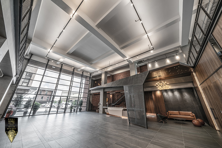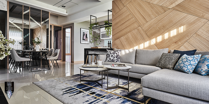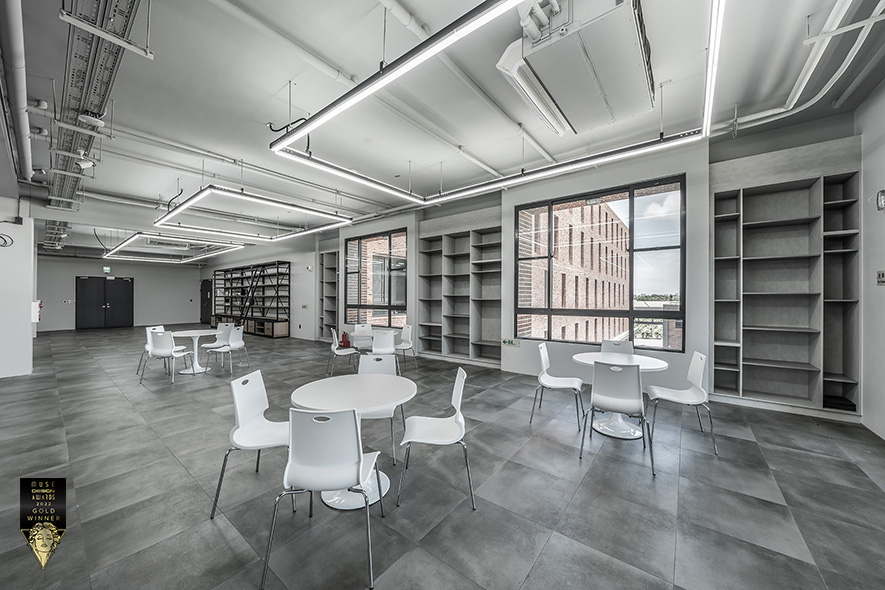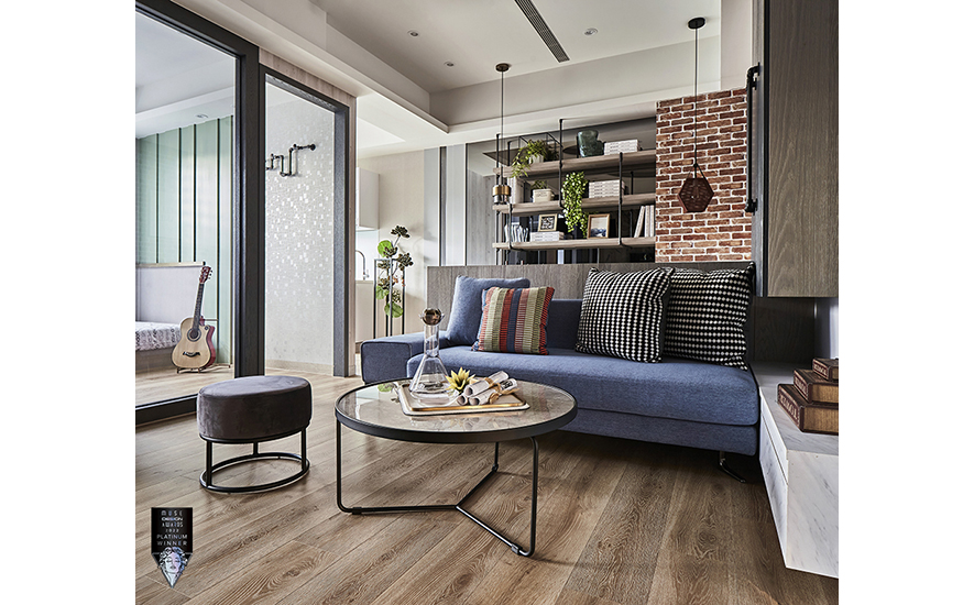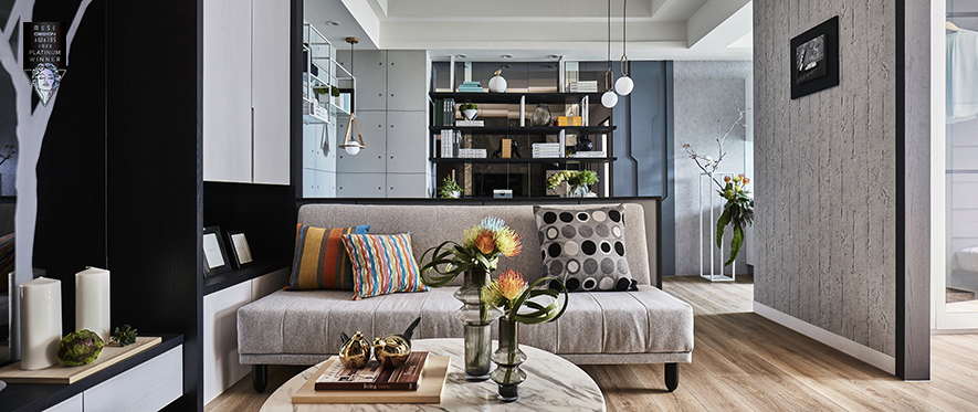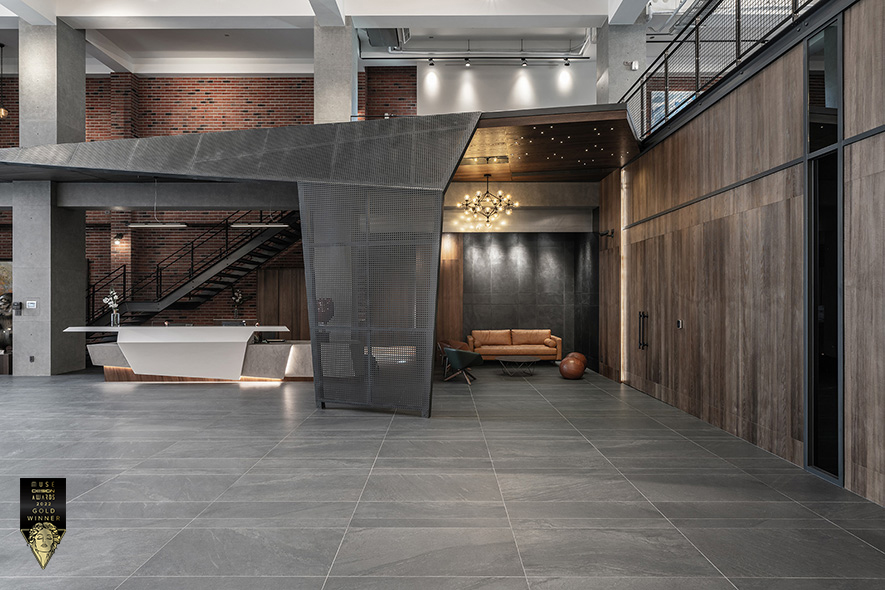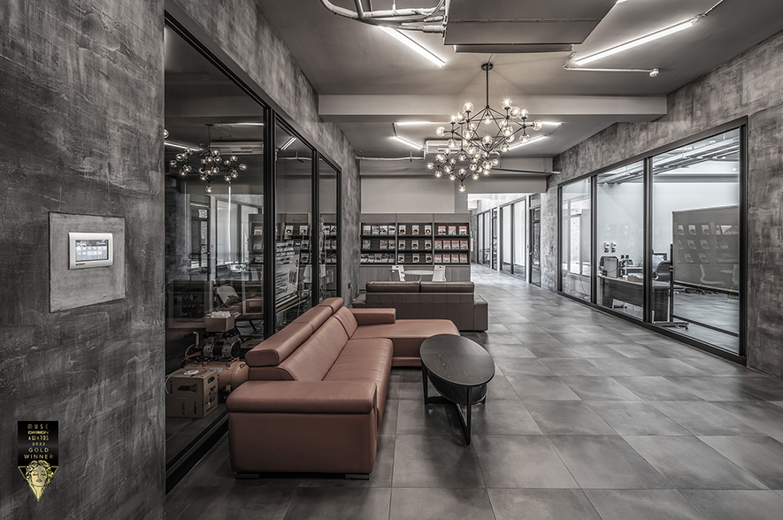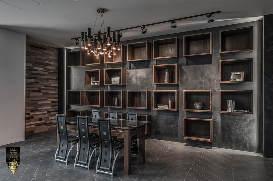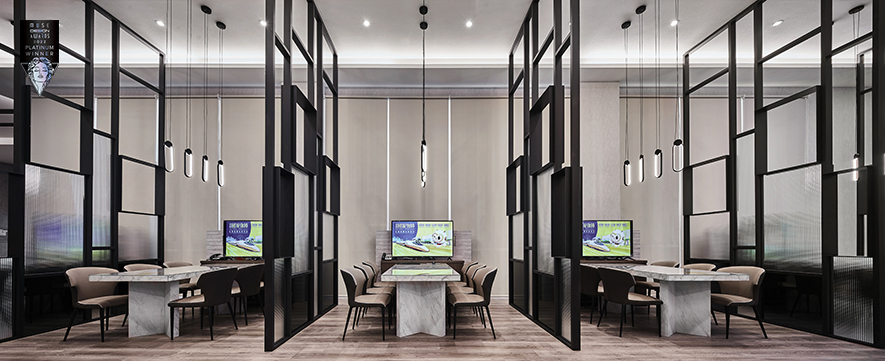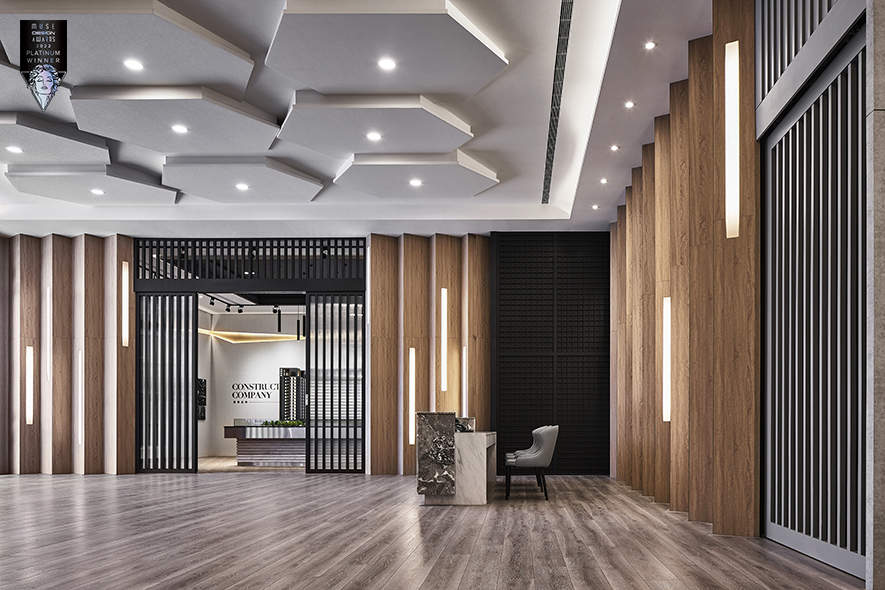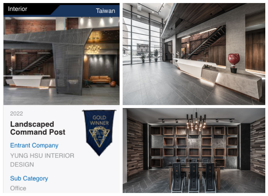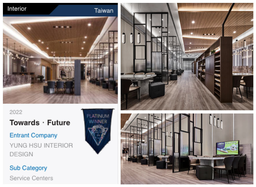 詠絮室內設計 於接待中心《近・未來》中,以俐落網格線條搭配柵欄式的直線框體,點綴亮麗的黃、藍二色,使建物外觀在夜晚燈光的透射下,映出絢爛奪目光彩,而辦公作品《驀色香沉》,則呈現鐵件、紅磚以及木頭等多種異材質組合的設計美感,勾勒現代大氣的空間格調;兩作於2022賽事分別奪得「鉑金獎」、「金獎」殊榮,成功地將品牌聲譽推向高峰!