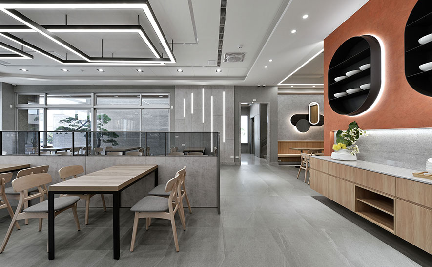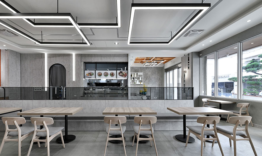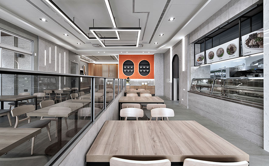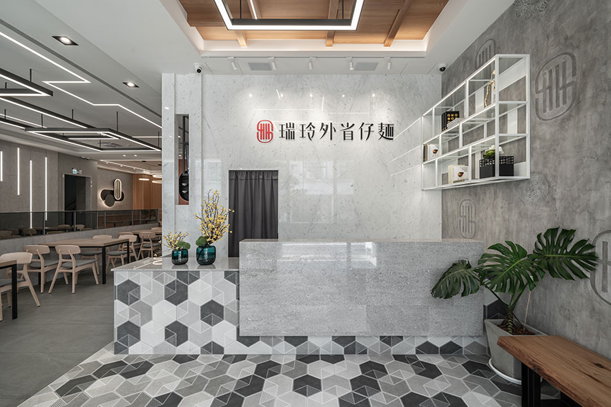 翻轉街邊小吃熱氣蒸騰、環境隨性的印象,詠絮室內設計 以寬裕的動線、敞亮的用餐空間,搭配俐落的幾何線條與肌理豐富的特殊塗料,如同一碗麵食蘸著風味各異的醬料,將現代美學工藝揉入傳統麵店,為深耕多年的在地老店另闢嶄新風貌,也賦予顧客味蕾與視覺兼具的美食饗宴。