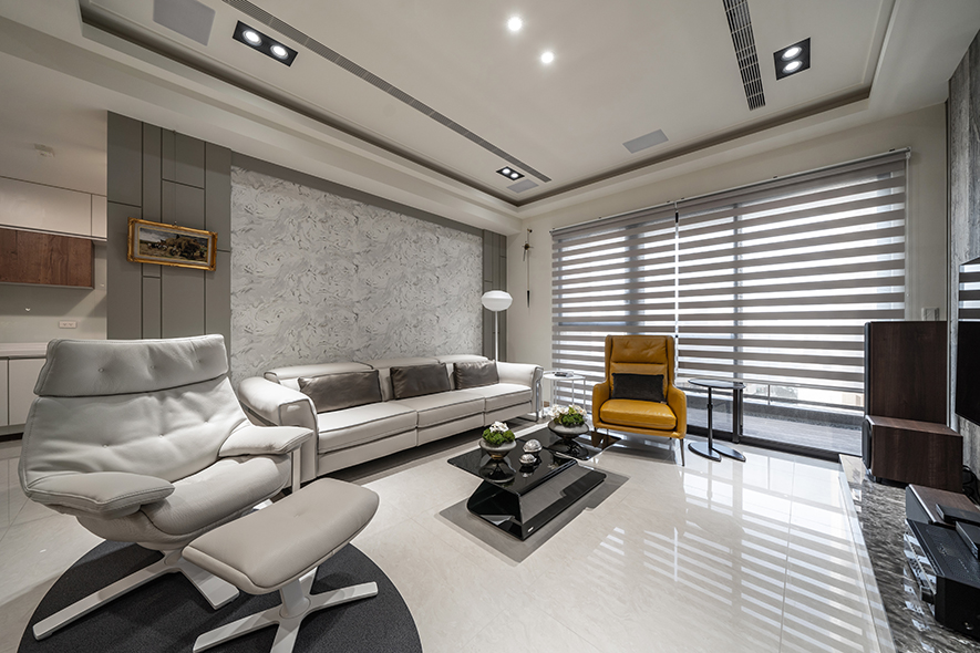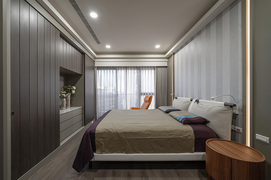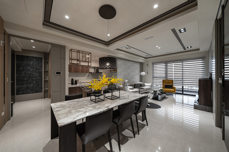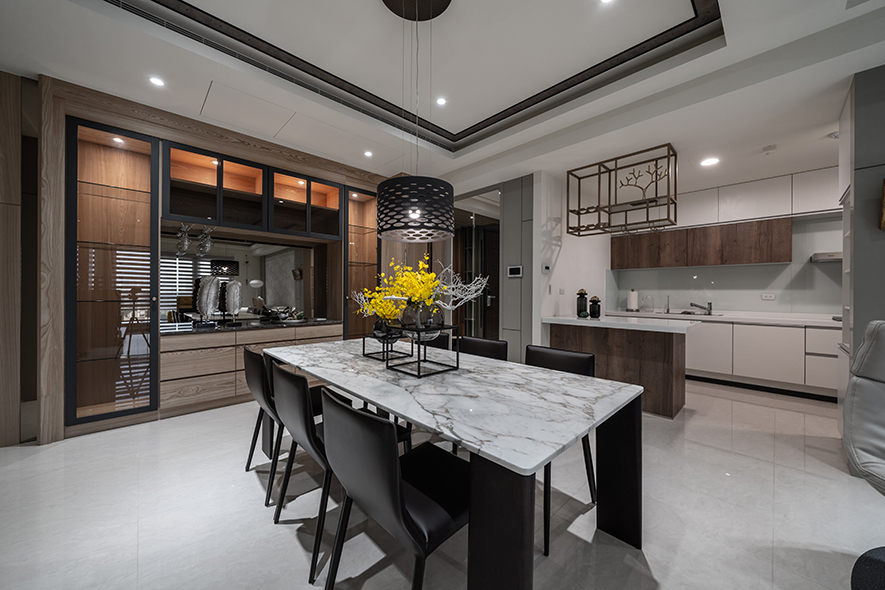 層次豐富的空間中,樸實溫潤的木質交織具現代感的石材,光潔的金屬與鏡面輝映出細膩的光澤,令異材相偕之美進駐家宅,另於天壁與立面搭佐流暢的線條元素,塑造沉穩俐落的時尚感受,相伴業主一家三口渡過質感日常。