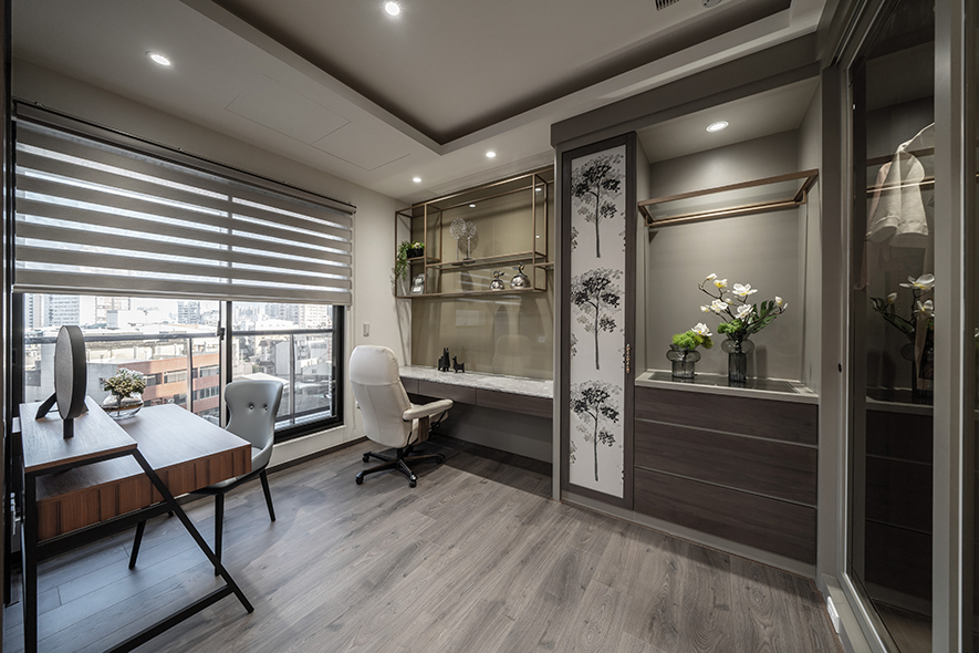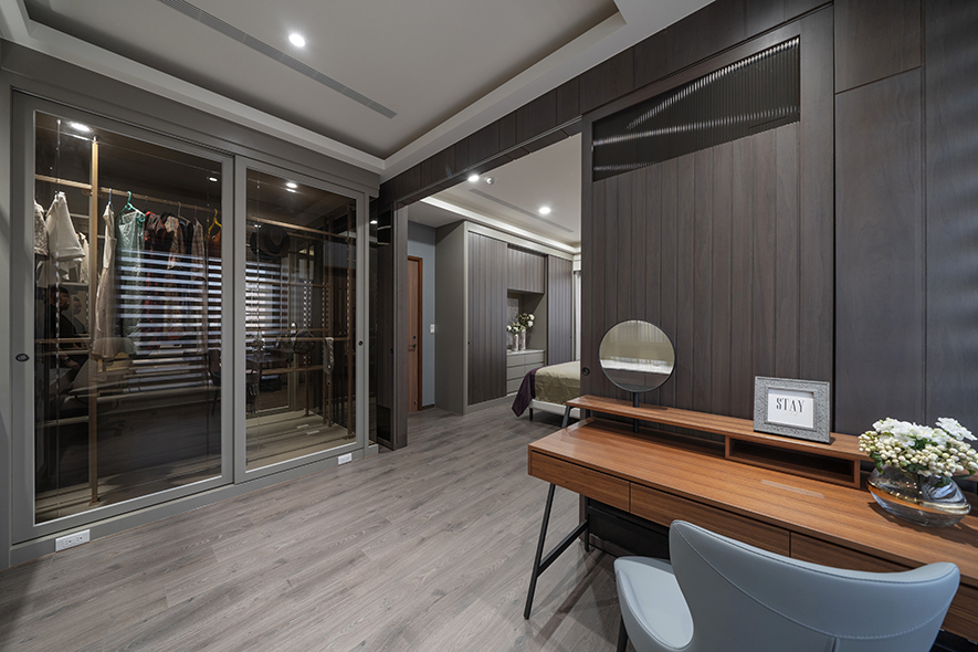 詠絮室內設計 回應屋主明確區分公、私領域的需求,重劃室內格局,打通主臥與鄰近房間,規劃為更衣間兼工作室,並於玄關及餐廳側邊設置眾多櫃體,輔以清玻櫃門,兼顧收納及展示效果,實現典雅美觀的機能家宅。