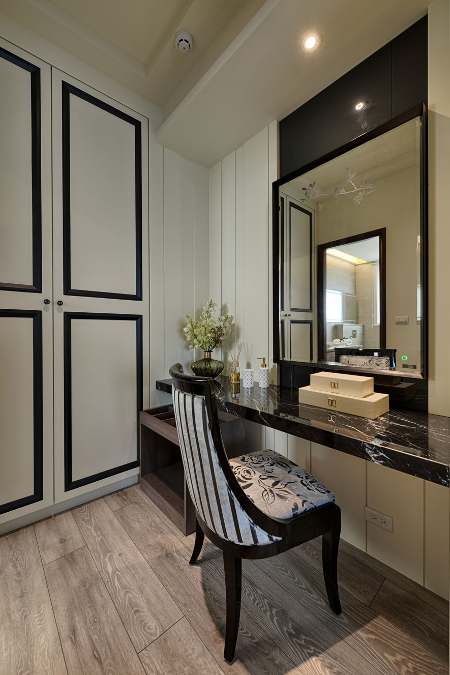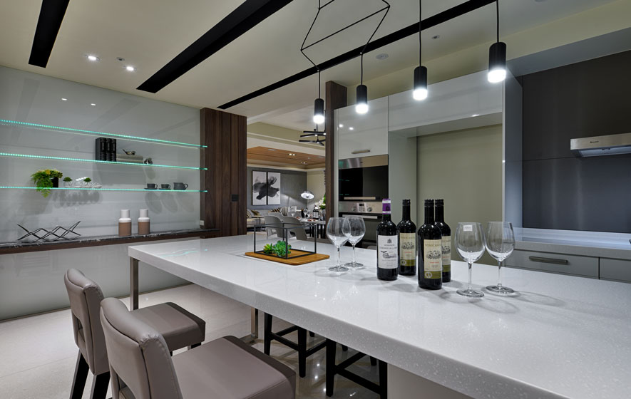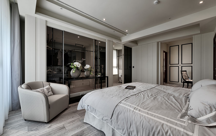 由於著重視覺上的色彩和諧,設計團隊以不影響主調氛圍為前提,為不同的使用空間,採用各色建材,如實木貼皮、皮革裱布、大理石等,以材質本身的細緻紋理賦予場域更多質感;各區塊中,灰鏡及茶鏡的點綴,如水面般映射室內,令環境更為澄透。