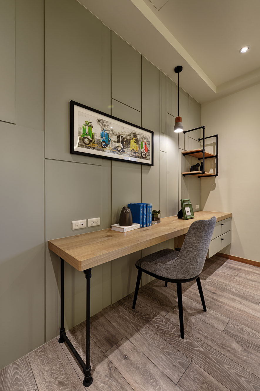 在格局上,客廳、書房、餐廚區等皆設計為開放式,不安排多餘的隔牆,使空間在視覺上更增寬敞感;風格定調為現代簡約,因此傢俱造型以俐落為主,飾以溫厚純樸的色調,打造輕盈無壓的舒適居所。